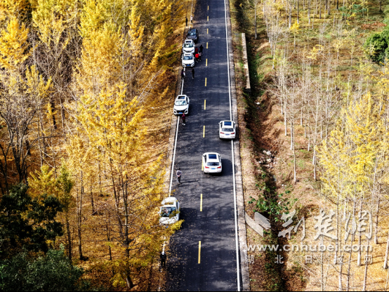 在湖北钟祥大口森林公园,金黄的银杏叶铺满了道路和山丘,就像一幅秋天的油画。通讯员供图